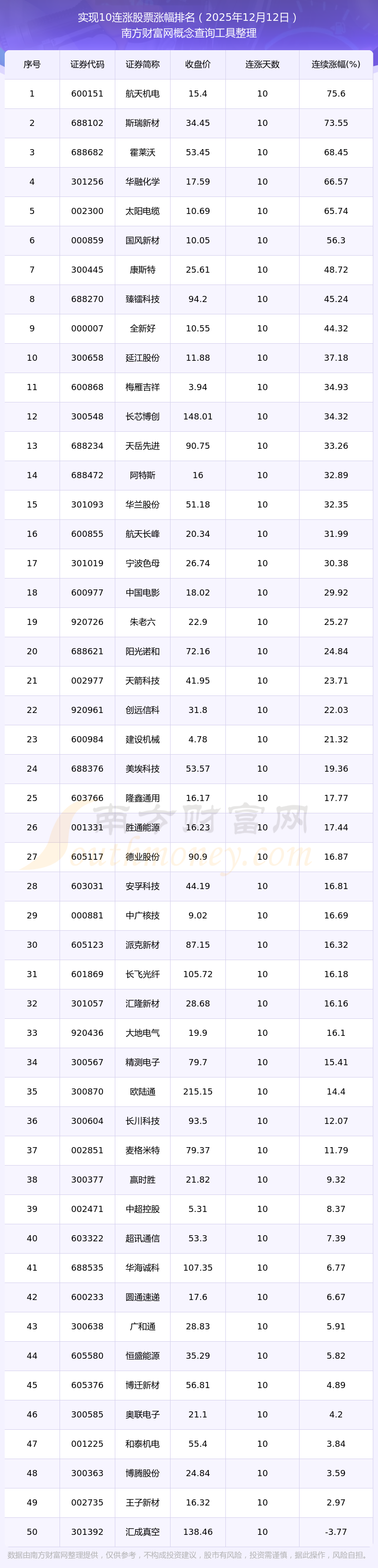 2025年12月12日實(shí)現(xiàn)10連漲股票漲幅排名