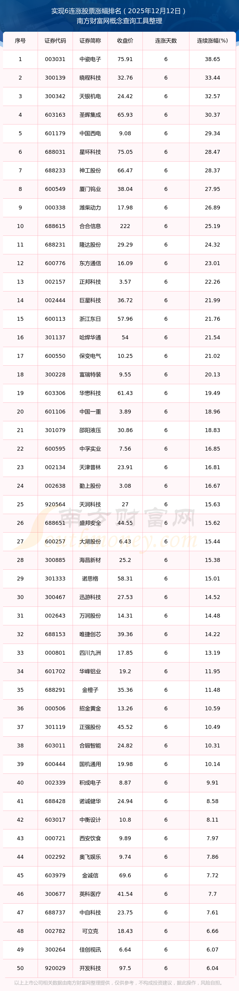 2025年12月12日實現(xiàn)6連漲股票漲幅排名