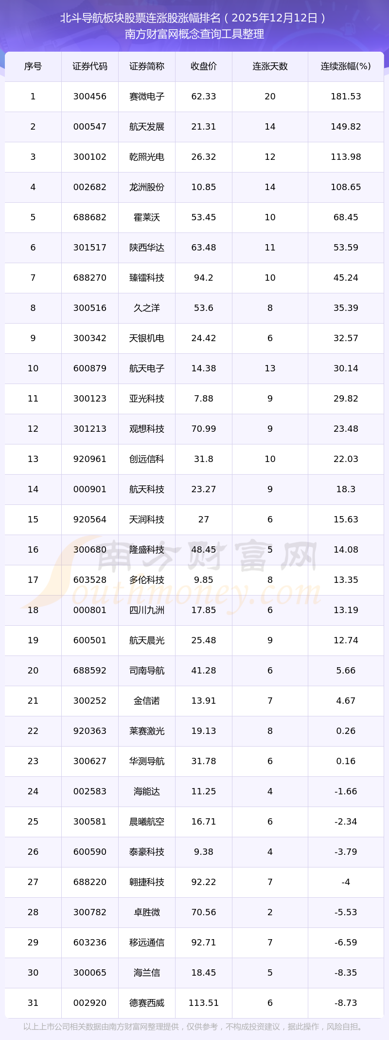 2025年12月12日北斗導(dǎo)航板塊股票連漲股漲幅排名