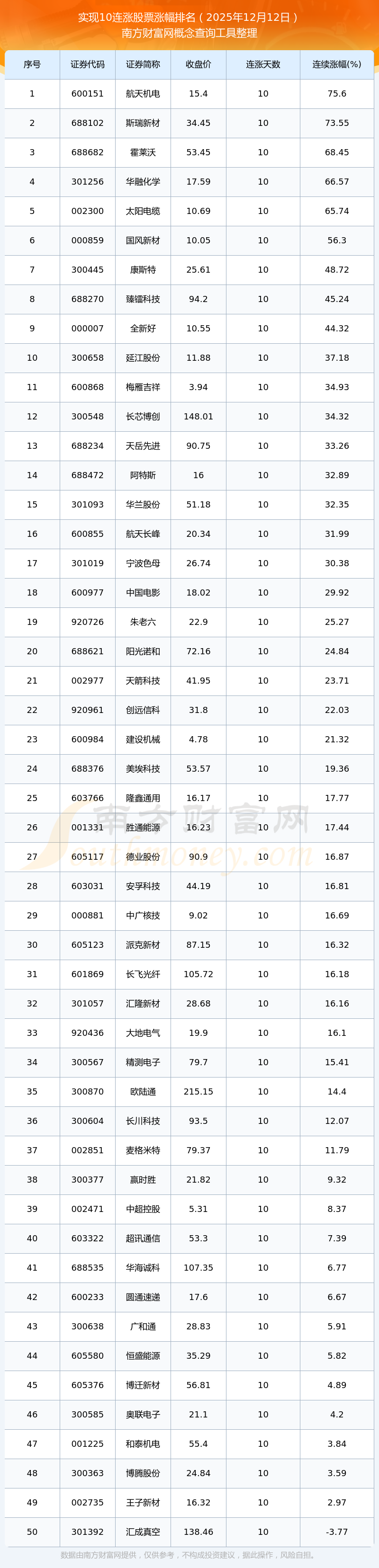 2025年12月12日實(shí)現(xiàn)10連漲股票漲幅排名