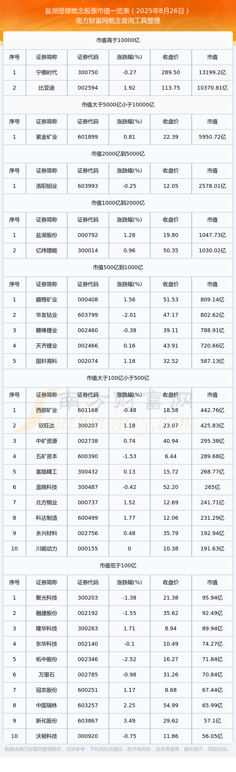截止2025年8月26日,鹽湖提鋰概念股票中聚光科技、融捷股份、隆華科技、東華科技等29家市值位于不足100億之列;西部礦業(yè)、欣旺達、中礦資源、五礦資本、富臨精工等27家市值位于100億到500億之列;藏格礦業(yè)、華友鈷業(yè)、贛鋒鋰業(yè)、天齊鋰業(yè)、國軒高科等5家市值位于500億到1000億之列;鹽湖股份和億緯鋰能市值位于1000億到2000億之列;洛陽鉬業(yè)市值位于2000億到5000億之列;紫金礦業(yè)市值位于5000億到10000億之列;寧德時代和比亞迪市值位于大于10000億之列。