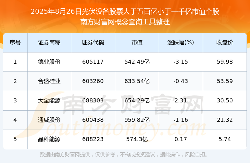 截止2025年8月26日,光伏設備股票市值大于五百億小于一千億的個股共有5只。其中,市值較高的有通威股份、大全能源、合盛硅業(yè),市值分別為959.82億元、654.29億元、633.54億元。