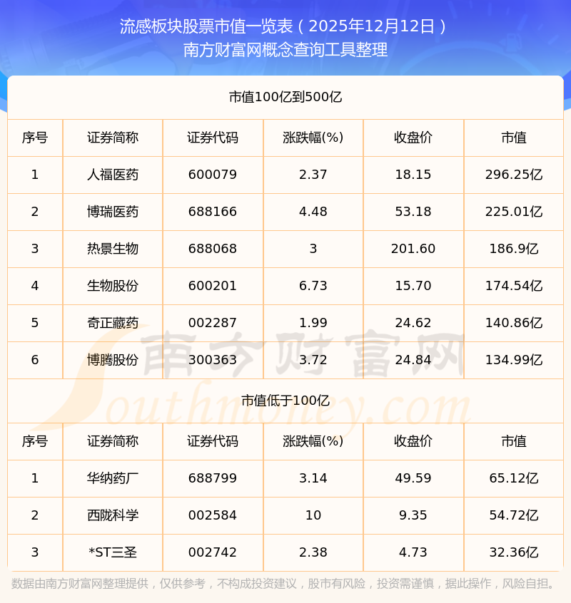截止2025年12月12日,流感板塊股票中海南海藥、太極集團、華北制藥、珍寶島、哈藥股份等58家市值位于不足100億之列;華潤三九、同仁堂、白云山、長春高新、天壇生物等36家市值位于100億到500億之列;云南白藥、復星醫(yī)藥、東陽光、上海醫(yī)藥、萬泰生物等5家市值位于500億到1000億之列。