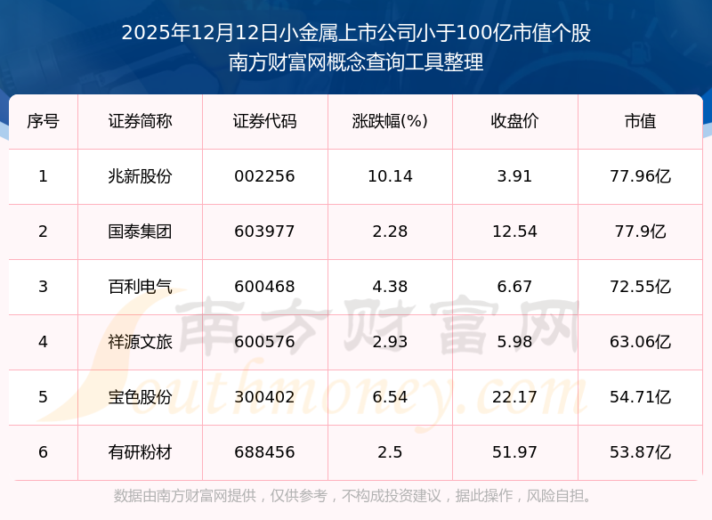 截止2025年12月12日,小金屬上市公司市值小于100億的個股共有6只。其中,市值較高的有兆新股份、國泰集團、百利電氣,市值分別為77.96億元、77.9億元、72.55億元。