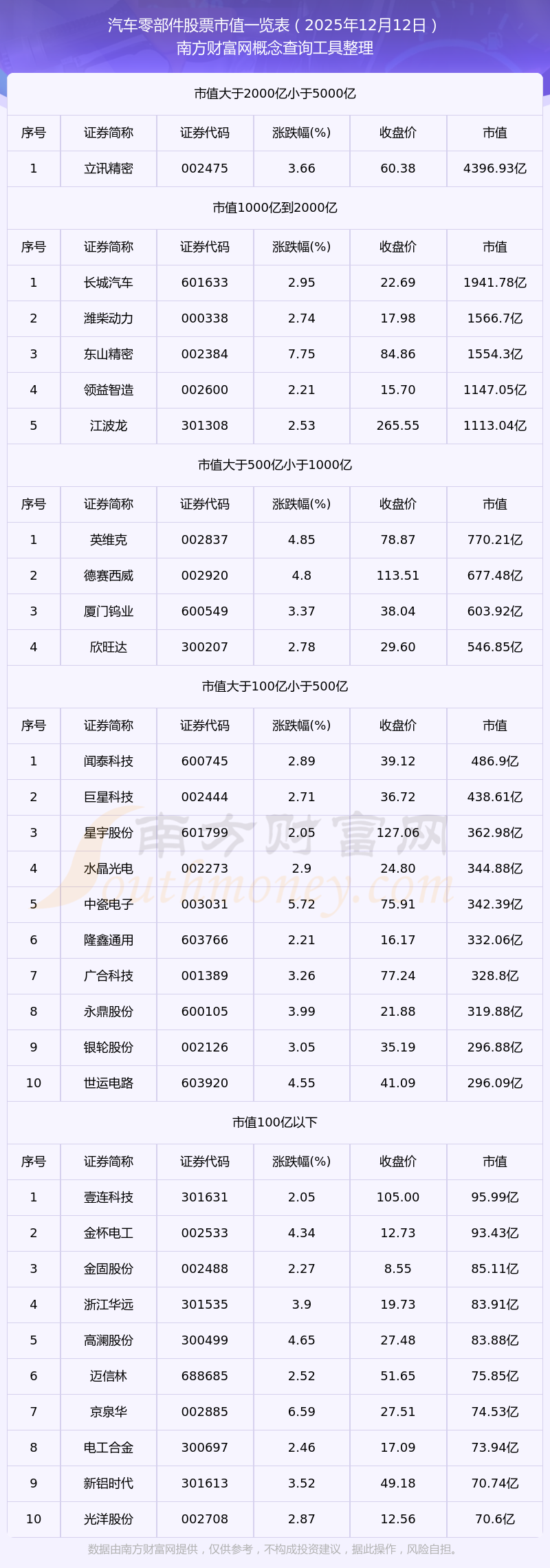 截止2025年12月12日,汽車零部件股票中海天精工、漢馬科技、湖南天雁等58家市值位于不足100億之列;聞泰科技、中創(chuàng)智領(lǐng)、北汽藍(lán)谷等31家市值位于100億到500億之列;廣汽集團(tuán)、臥龍電驅(qū)、華域汽車、廈門鎢業(yè)等5家市值位于500億到1000億之列;長城汽車、上汽集團(tuán)、福耀玻璃、拓普集團(tuán)、江淮汽車等5家市值位于1000億到2000億之列;賽力斯市值位于2000億到5000億之列。