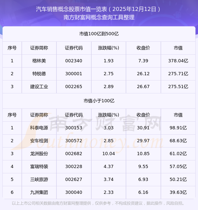 截止2025年12月12日,汽車銷售概念股票中科泰電源、奧特佳、國機汽車等32家市值位于不足100億之列;芒果超媒、格林美、一汽解放、海格通信等20家市值位于100億到500億之列;廣汽集團和天齊鋰業(yè)市值位于500億到1000億之列;中國中鐵和長安汽車市值位于1000億到2000億之列;比亞迪市值位于5000億到10000億之列。