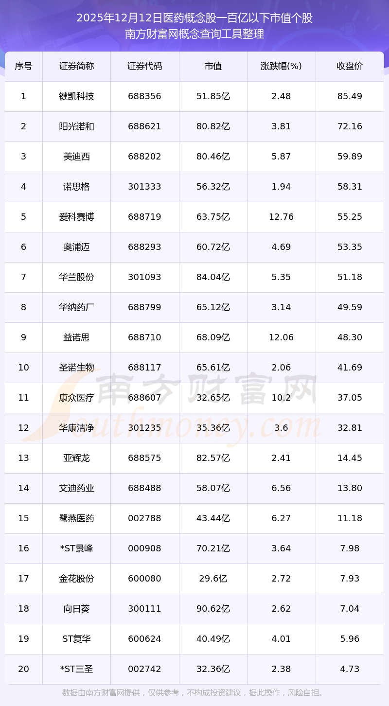 截止2025年12月12日,醫(yī)藥概念股市值一百億以下的個(gè)股共有21只。其中,市值較高的有向日葵、華蘭股份、亞輝龍,市值分別為90.62億元、84.04億元、82.57億元。