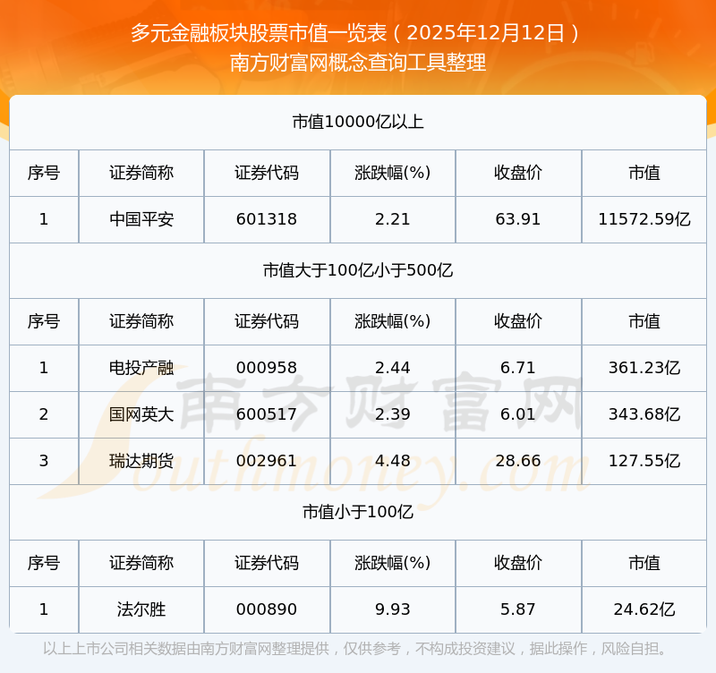 截止2025年12月12日,多元金融概念股中翠微股份、九鼎投資、海欣股份、愛建集團等14家市值位于不足100億之列;國投資本、越秀資本、電投產(chǎn)融、XD江蘇金、國網(wǎng)英大等19家市值位于100億到500億之列;中油資本市值位于1000億到2000億之列;中國平安市值位于大于10000億之列。