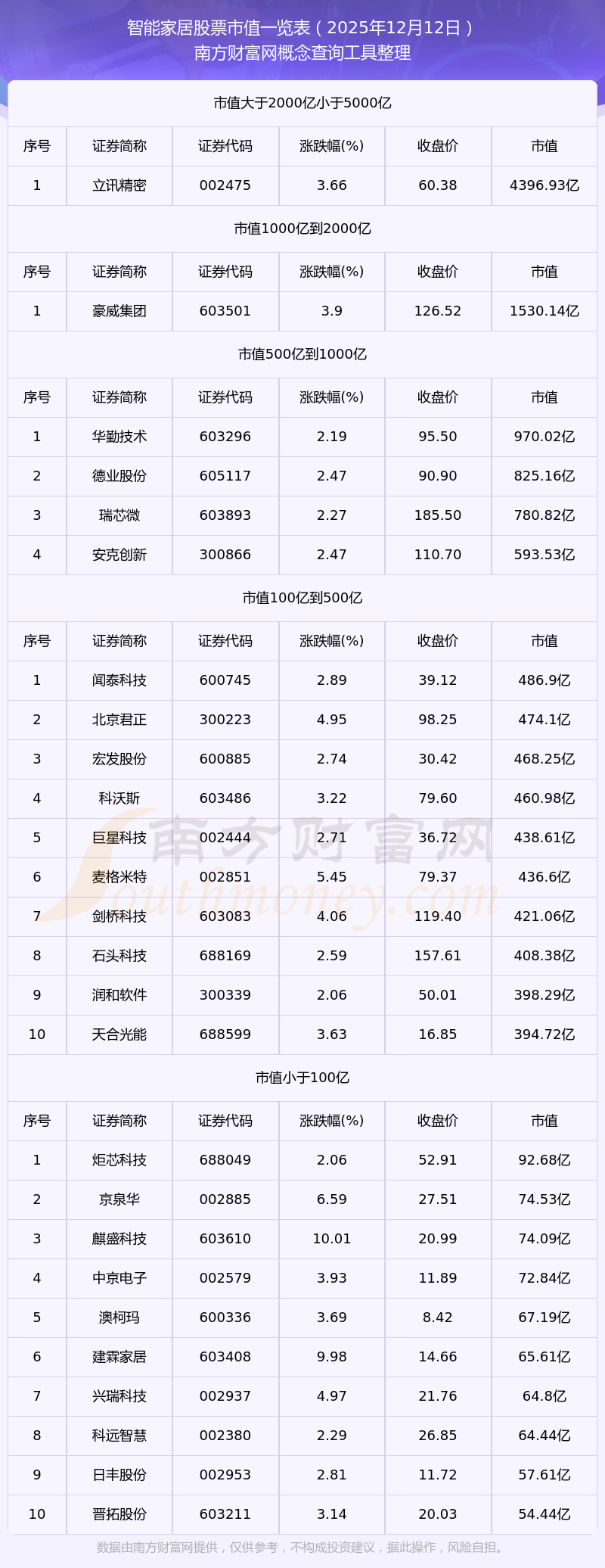 截止2025年12月12日,智能家居上市公司中炬芯科技、黃河旋風(fēng)、*ST亞振等57家市值位于不足100億之列;聞泰科技、宏發(fā)股份、士蘭微、科沃斯等29家市值位于100億到500億之列;華勤技術(shù)、德業(yè)股份、三六零、瑞芯微等6家市值位于500億到1000億之列;中國聯(lián)通、豪威集團(tuán)、兆易創(chuàng)新等3家市值位于1000億到2000億之列;海爾智家市值位于2000億到5000億之列。