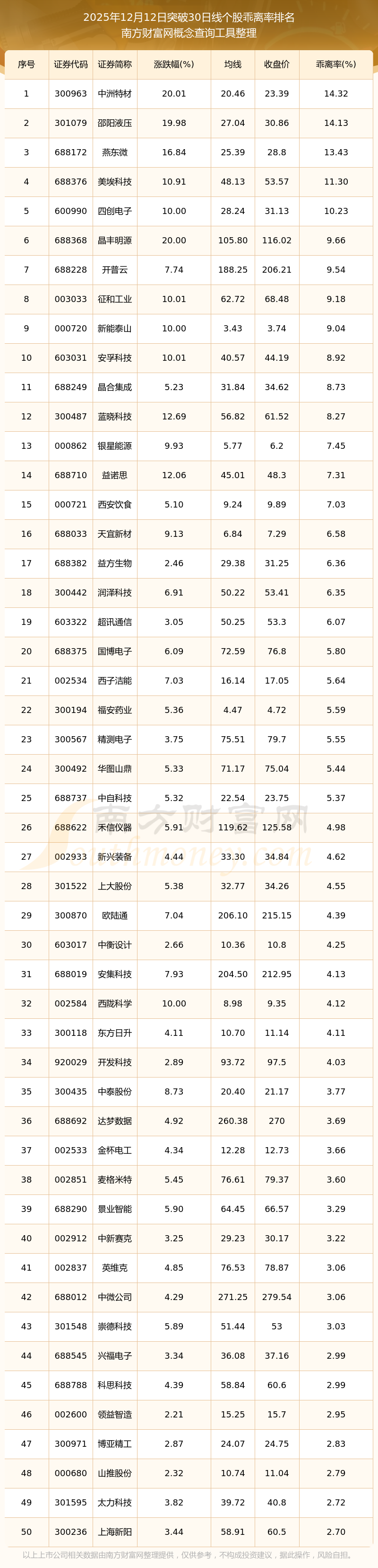 根據(jù)南方財富網(wǎng)概念查詢工具數(shù)據(jù)統(tǒng)計,截止2025年12月12日收盤,共有103只個股收盤價向上突破了30日線,其中乖離率較大的個股有中洲特材、邵陽液壓、燕東微、美?萍肌⑺膭(chuàng)電子等,乖離率分別為14.32%、14.13%、13.43%、11.30%、10.23%。