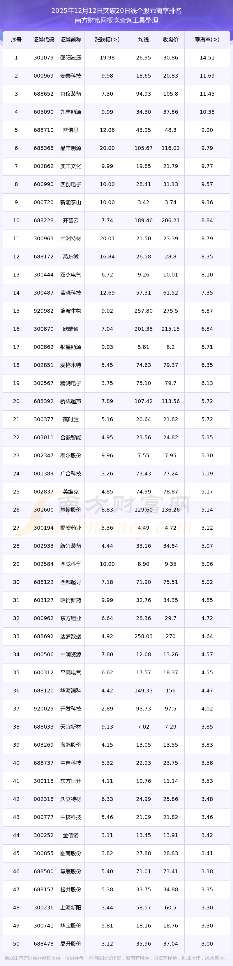 2025年12月12日突破20日線個(gè)股乖離率排名