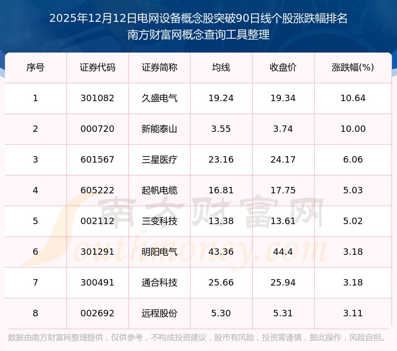 2025年12月12日電網(wǎng)設(shè)備概念股突破90日線個(gè)股漲跌幅排名