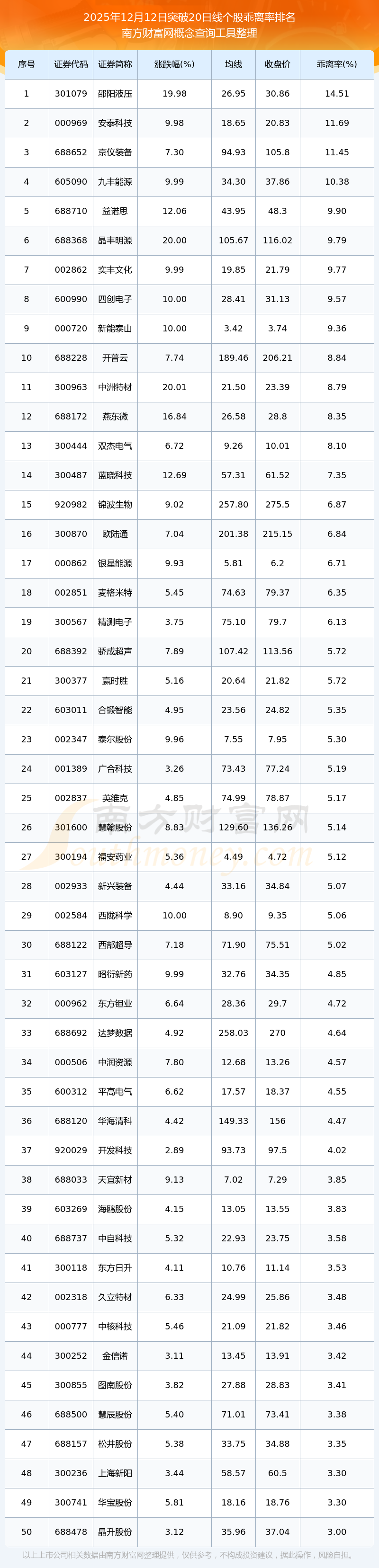 根據(jù)南方財富網(wǎng)概念查詢工具數(shù)據(jù)統(tǒng)計,截止2025年12月12日收盤,共有133只個股收盤價向上突破了20日線,其中乖離率較大的個股有邵陽液壓、安泰科技、京儀裝備、九豐能源、益諾思等,乖離率分別為14.51%、11.69%、11.45%、10.38%、9.90%。