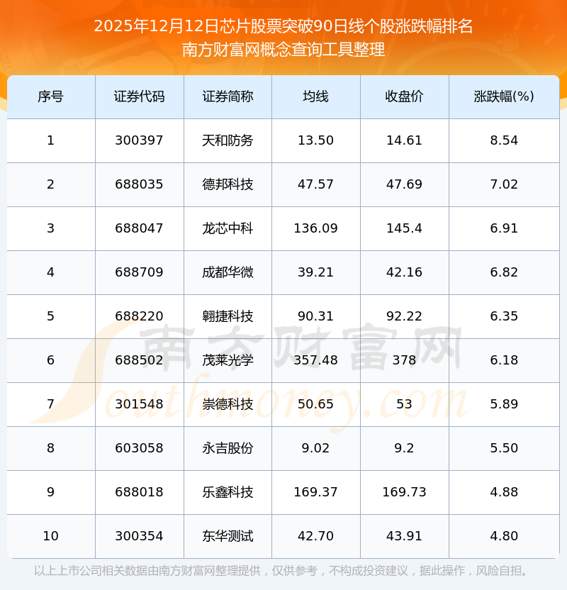 根據(jù)南方財富網(wǎng)概念查詢工具數(shù)據(jù)統(tǒng)計,截止2025年12月12日收盤,芯片股票共有27只個股收盤價向上突破了90日線。其中漲幅較大的個股有天和防務(wù)、德邦科技、龍芯中科等,漲幅分別為8.54%、7.02%、6.91%。
