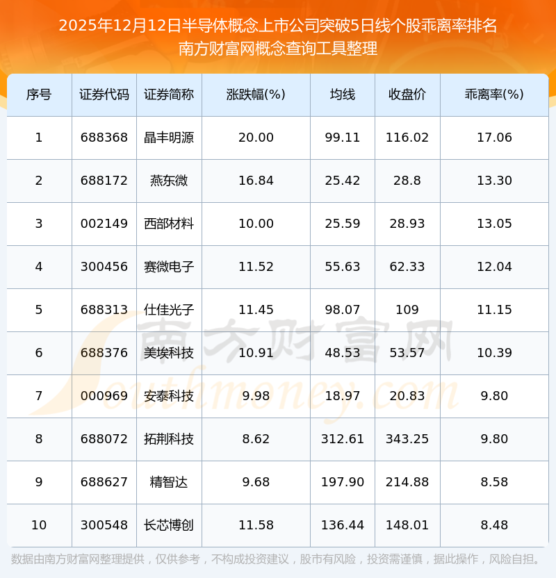 根據南方財富網概念查詢工具數據統(tǒng)計,截止2025年12月12日收盤,半導體概念上市公司共有92只個股收盤價向上突破了5日線。其中乖離率較大的個股有晶豐明源、燕東微、西部材料等,乖離率分別為17.06%、13.30%、13.05%。