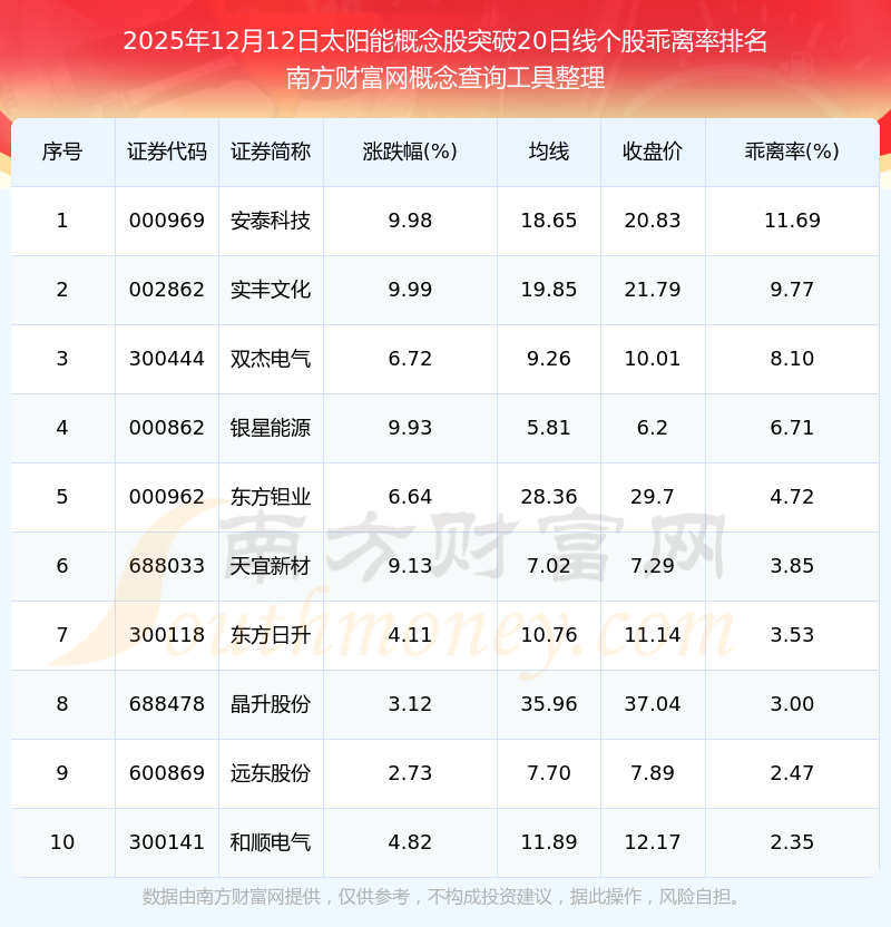 根據(jù)南方財(cái)富網(wǎng)概念查詢工具數(shù)據(jù)統(tǒng)計(jì),截止2025年12月12日收盤(pán),太陽(yáng)能概念股共有18只個(gè)股收盤(pán)價(jià)向上突破了20日線。其中乖離率較大的個(gè)股有安泰科技、實(shí)豐文化、雙杰電氣等,乖離率分別為11.69%、9.77%、8.10%。