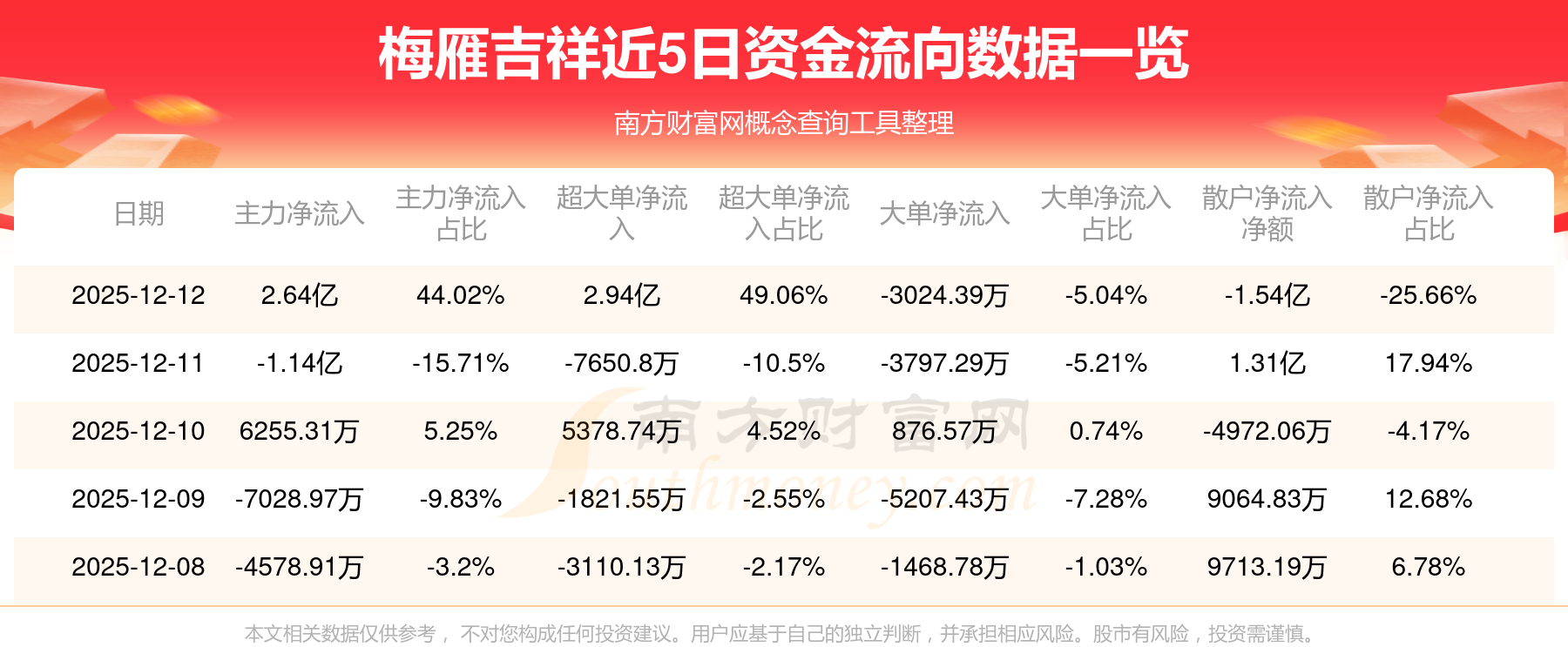 12月12日消息,梅雁吉祥資金凈流入2.64億元,超大單資金凈流入2.94億元,換手率7.74%,成交金額5.7億元。