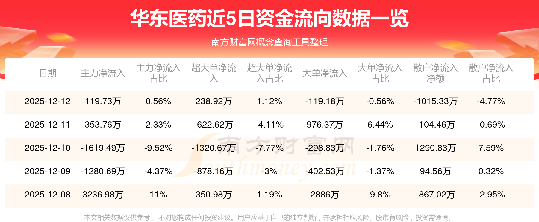 12月12日消息,華東醫(yī)藥12月12日主力凈流入119.73萬元,超大單凈流入238.92萬元,大單凈流出119.18萬元,散戶凈流出1015.33萬元。