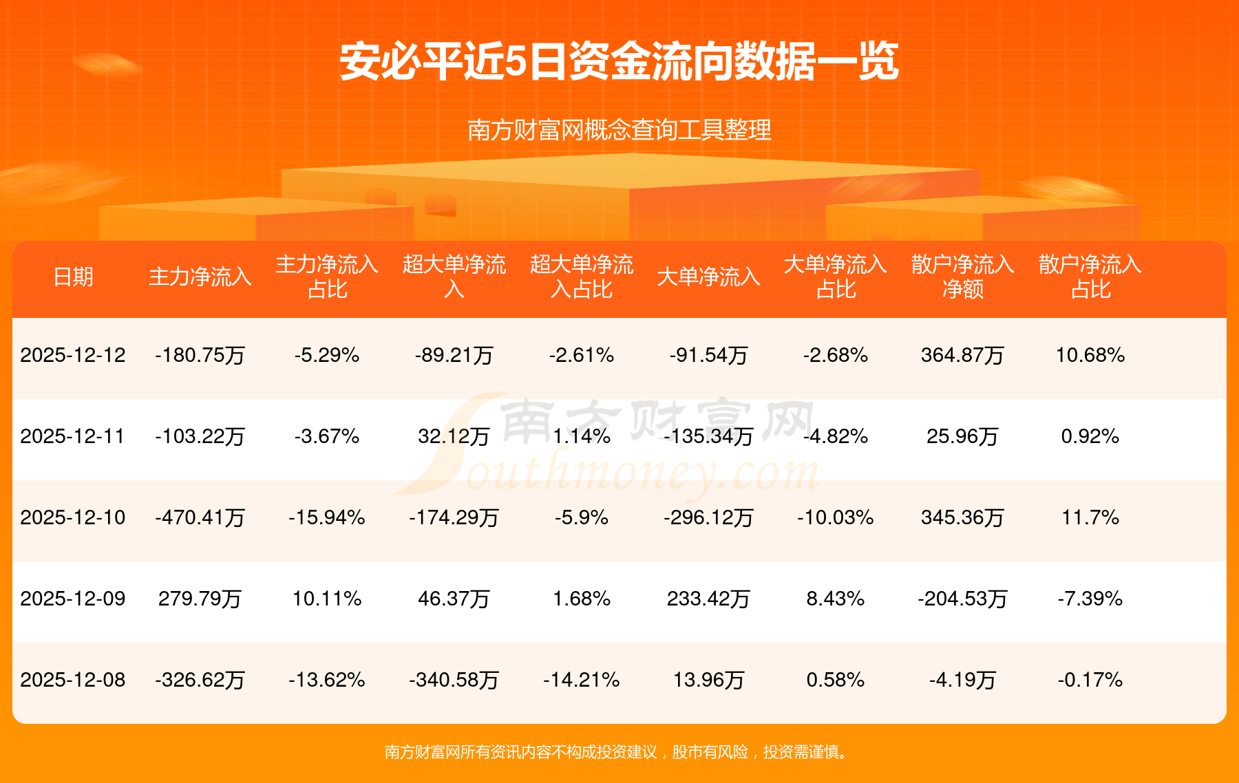 12月12日消息,安必平主力凈流出180.75萬元,超大單凈流出89.21萬元,散戶凈流入364.87萬元。