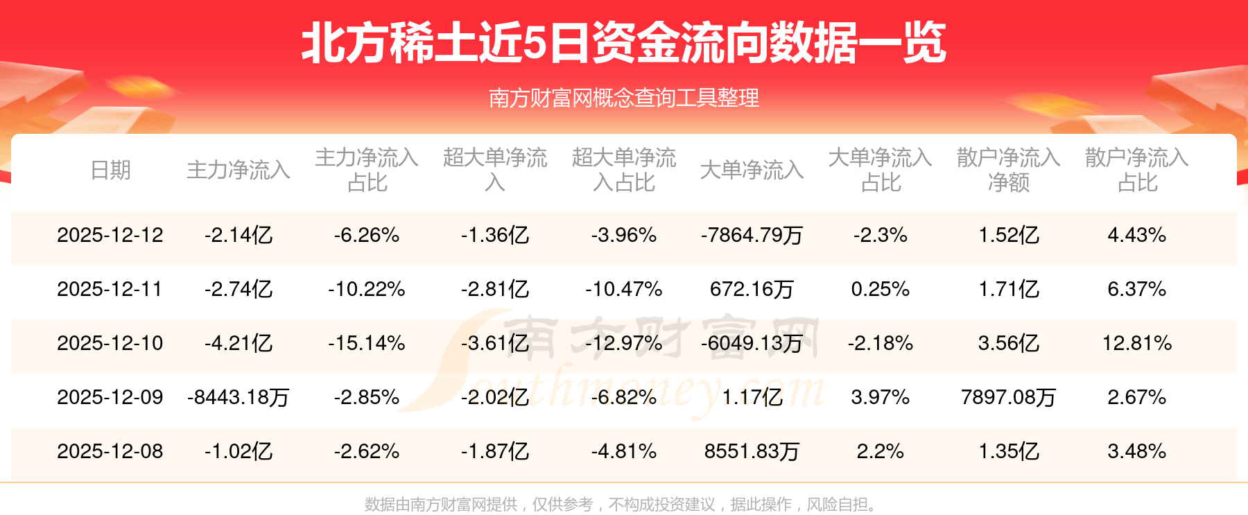12月12日消息,北方稀土12月12日主力資金凈流出2.14億元,超大單資金凈流出1.36億元,大單資金凈流出7864.79萬元,散戶資金凈流入1.52億元。