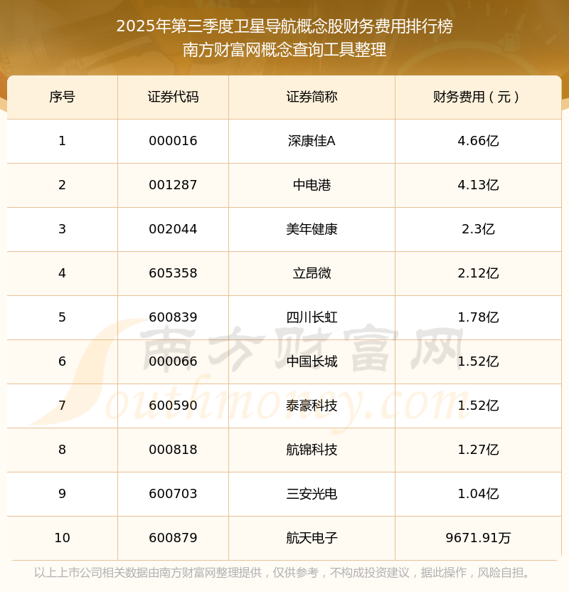 2025年第三季度衛(wèi)星導(dǎo)航概念股財(cái)務(wù)費(fèi)用排行榜如下:深康佳A(000016)的財(cái)務(wù)費(fèi)用總額高達(dá)4.66億,中電港(001287)和美年健康(002044)分別排名第二和第三,立昂微(605358)、四川長(zhǎng)虹(600839)、中國(guó)長(zhǎng)城(000066)、泰豪科技(600590)、航錦科技(000818)、三安光電(600703)、航天電子(600879)分別進(jìn)入前十,其財(cái)務(wù)費(fèi)用總額分別排名第4-10名。