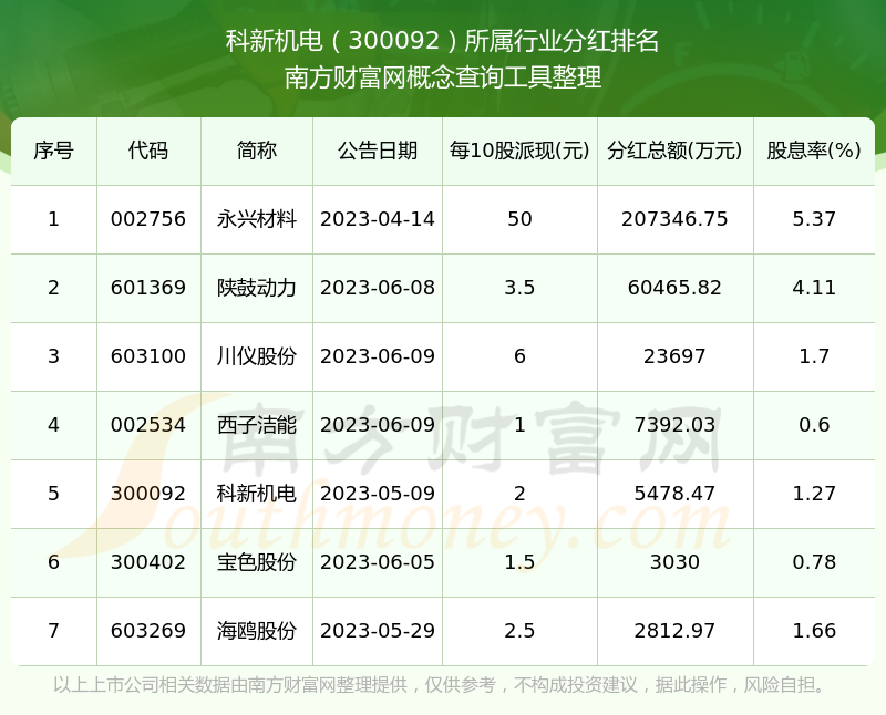 按照南方財(cái)富網(wǎng)趨勢(shì)選股系統(tǒng)統(tǒng)計(jì),科新機(jī)電所屬行業(yè)為氫能源行業(yè),氫能源行業(yè)分紅排名情況如下表:
