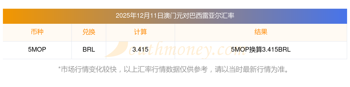 2025年12月11日澳門元貨幣匯率兌換:10澳門元=0.683巴西雷亞爾。