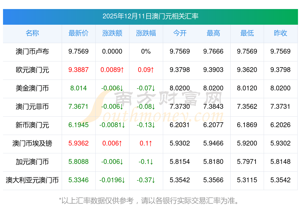 根據(jù)2025年12月11日匯率計(jì)算,澳門元兌換丹幣匯率最新價(jià)0.795500,今開價(jià)0.7963,昨收價(jià)0.7963,最高價(jià)0.7978,最低價(jià)0.7954。
