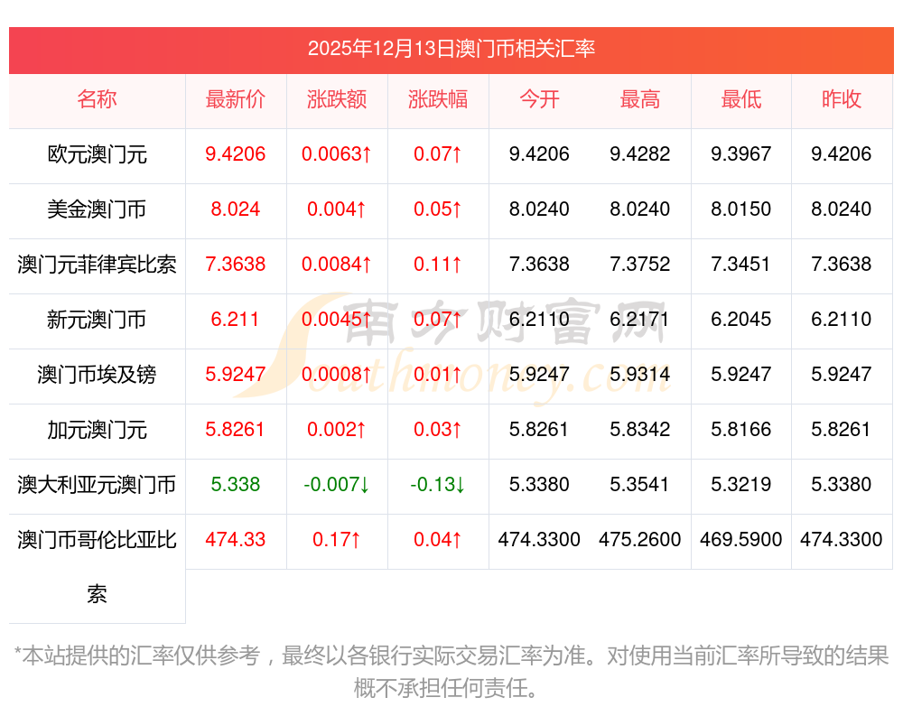 2025年12月13日澳門幣相關(guān)匯率查詢