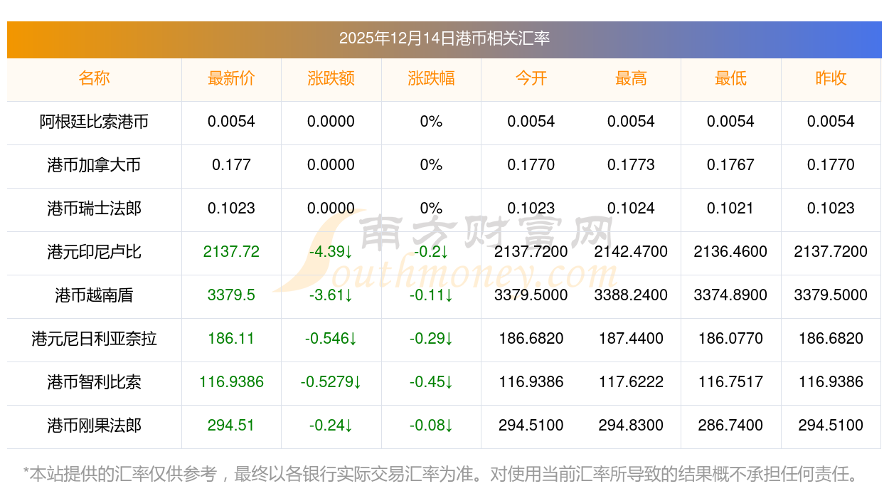 2025年12月14日最新消息,港幣兌換典幣最新匯率為1.190900,今開為1.1909,昨收為1.1909,最高為1.1946,最低為1.1871。