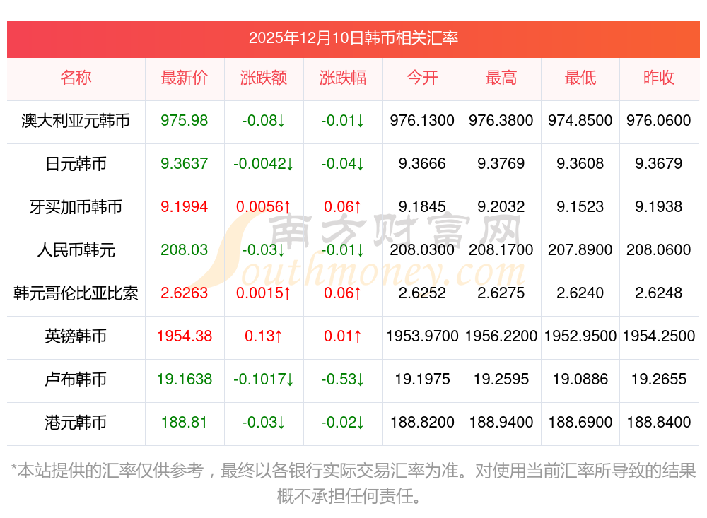 根據(jù)2025年12月10日匯率計算,KRW兌換MXN匯率最新價0.012380,今開價0.0124,昨收價0.0124,最高價0.0124,最低價0.0124。