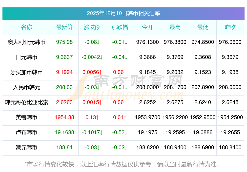 根據(jù)2025年12月10日匯率,韓幣兌換雷亞爾匯率最新價0.003697,今開價0.0037,昨收價0.0037,最高價0.0037,最低價0.0037。