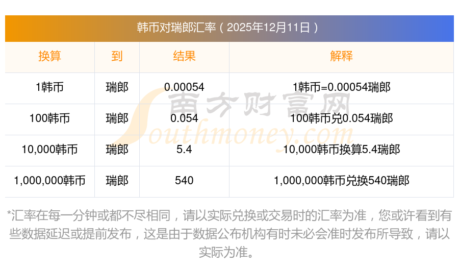 南方財富網(wǎng)為您提供韓幣對瑞郎匯率最新價格詳情。