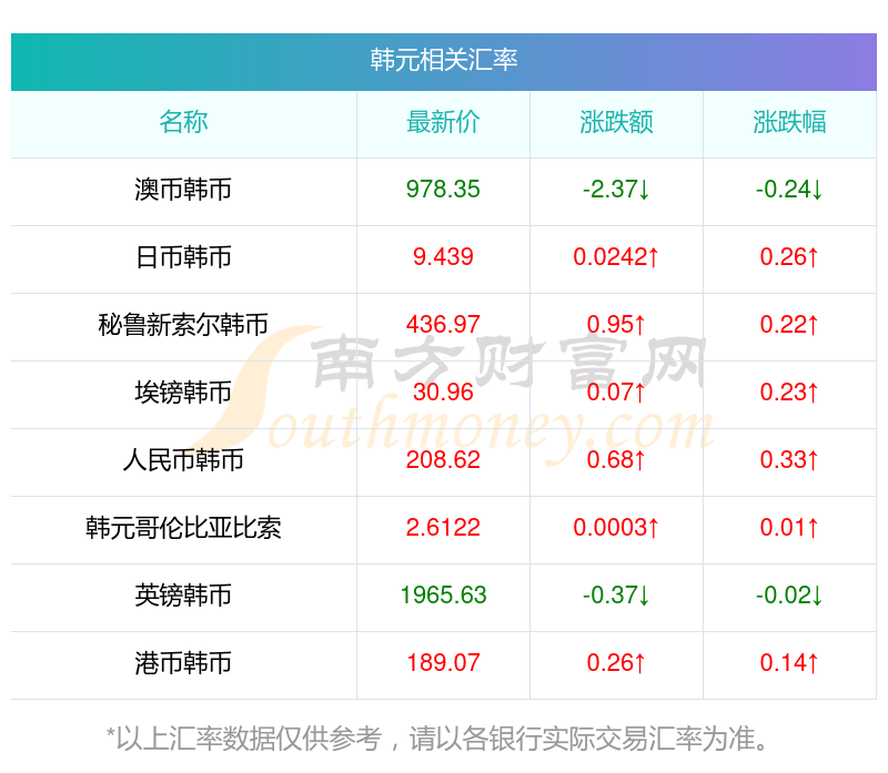 根據(jù)2025年12月11日匯率,韓元兌換哥倫比亞比索匯率最新2.612200,今開2.6119,昨收2.6119,最高2.6269,最低2.6082。