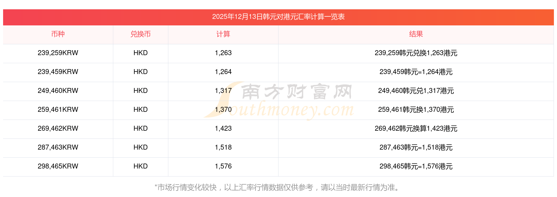 韓元兌港元匯率查詢表(2025年12月13日)