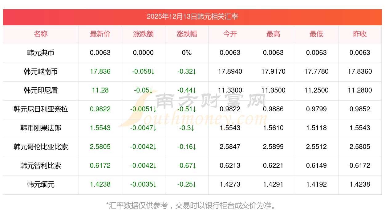 2025年12月13日韓元相關(guān)匯率查詢