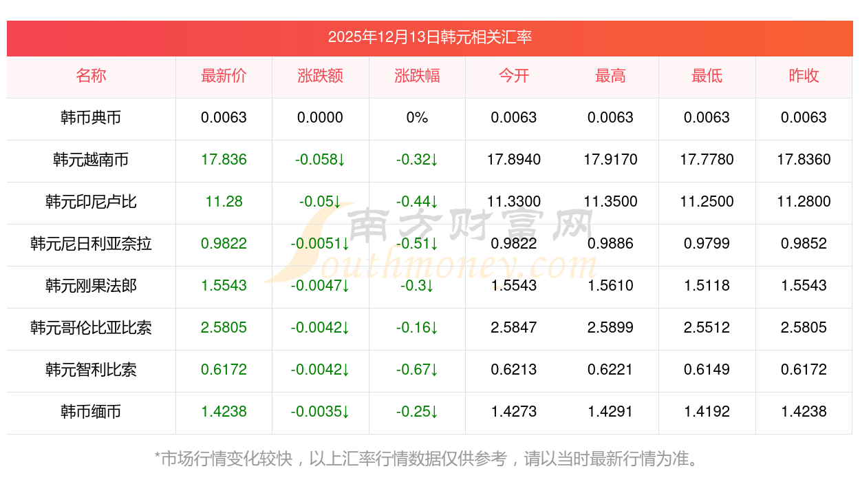 根據(jù)2025年12月13日匯率,韓元兌換挪幣匯率最新價(jià)0.006870,今開價(jià)0.0069,昨收價(jià)0.0069,最高價(jià)0.0069,最低價(jià)0.0068。