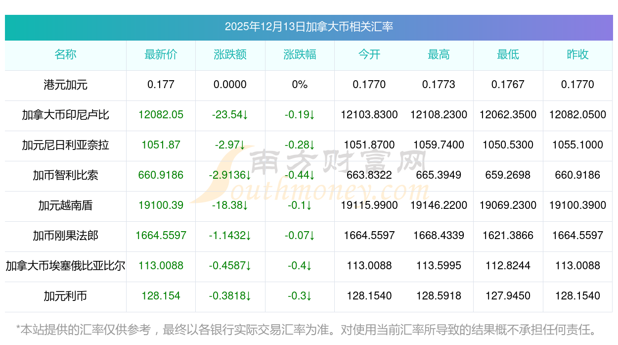 2025年12月13日加拿大幣相關(guān)匯率查詢(xún)