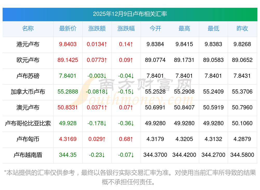 根據(jù)2025年12月9日匯率,盧布兌換瑞士法郎匯率最新價(jià)0.010540,今開(kāi)價(jià)0.0106,昨收價(jià)0.0105,最高價(jià)0.0106,最低價(jià)0.0105。
