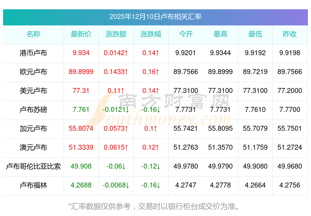 根據(jù)2025年12月10日匯率計算,盧布兌換福林匯率最新價4.268800,今開價4.2747,昨收價4.2756,最高價4.2778,最低價4.2664。