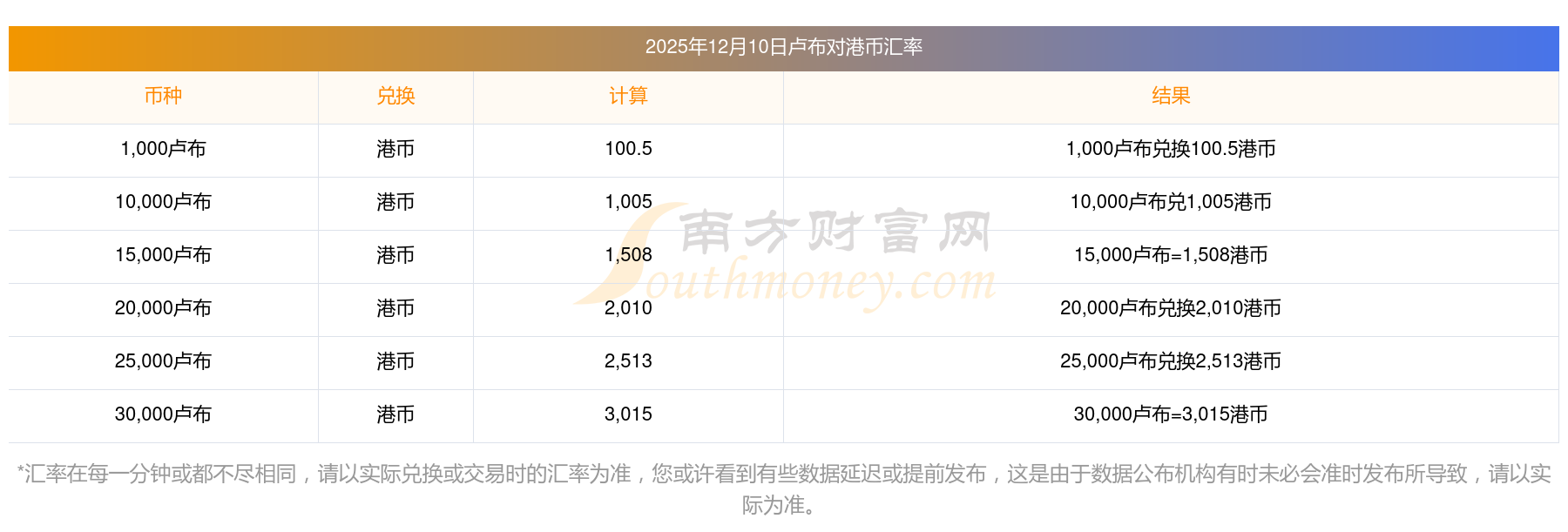 南方財(cái)富網(wǎng)為您提供盧布對港幣匯率最新價(jià)格詳情。