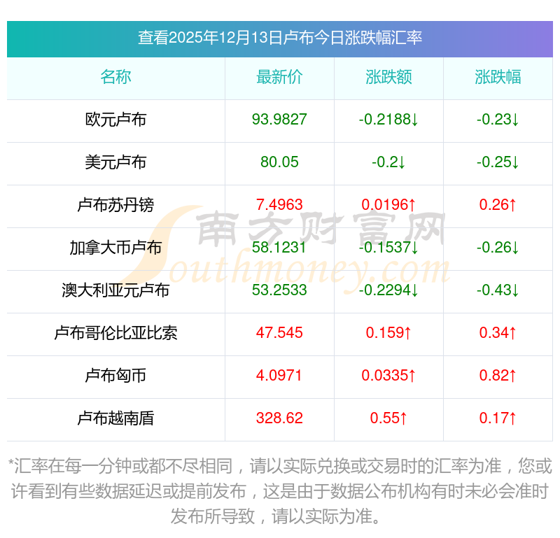 根據(jù)2025年12月13日匯率,盧布兌換匈幣匯率最新價4.097100,今開價4.0971,昨收價4.0974,最高價4.1295,最低價4.0607。