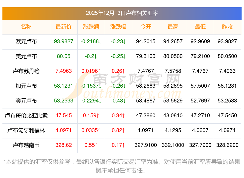 2025年12月13日盧布相關(guān)匯率查詢(xún)