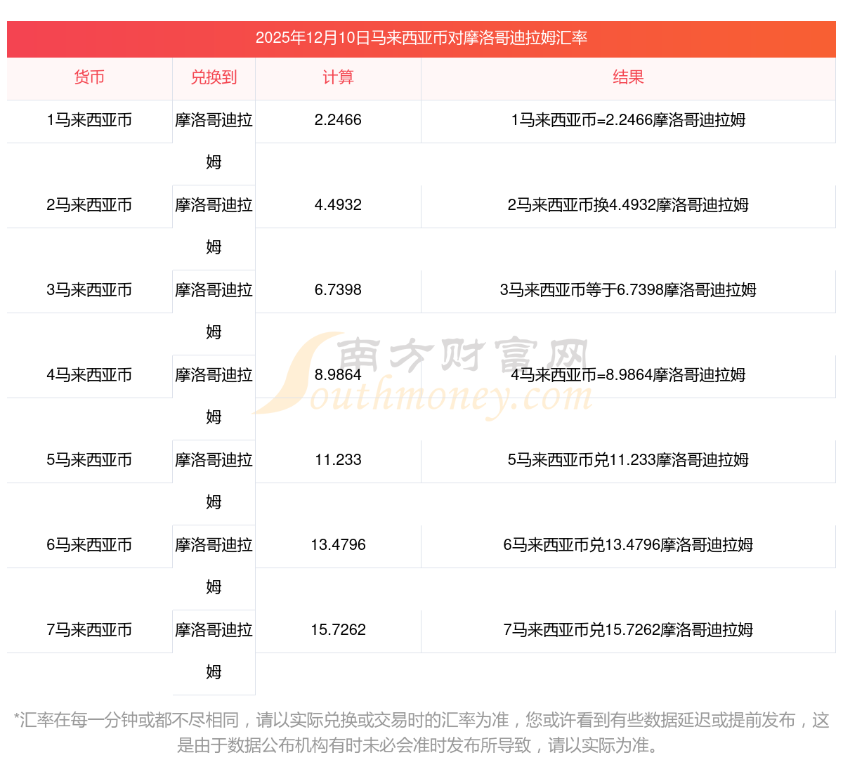 南方財(cái)富網(wǎng)為您提供馬來西亞幣對(duì)摩洛哥迪拉姆匯率最新價(jià)格詳情。