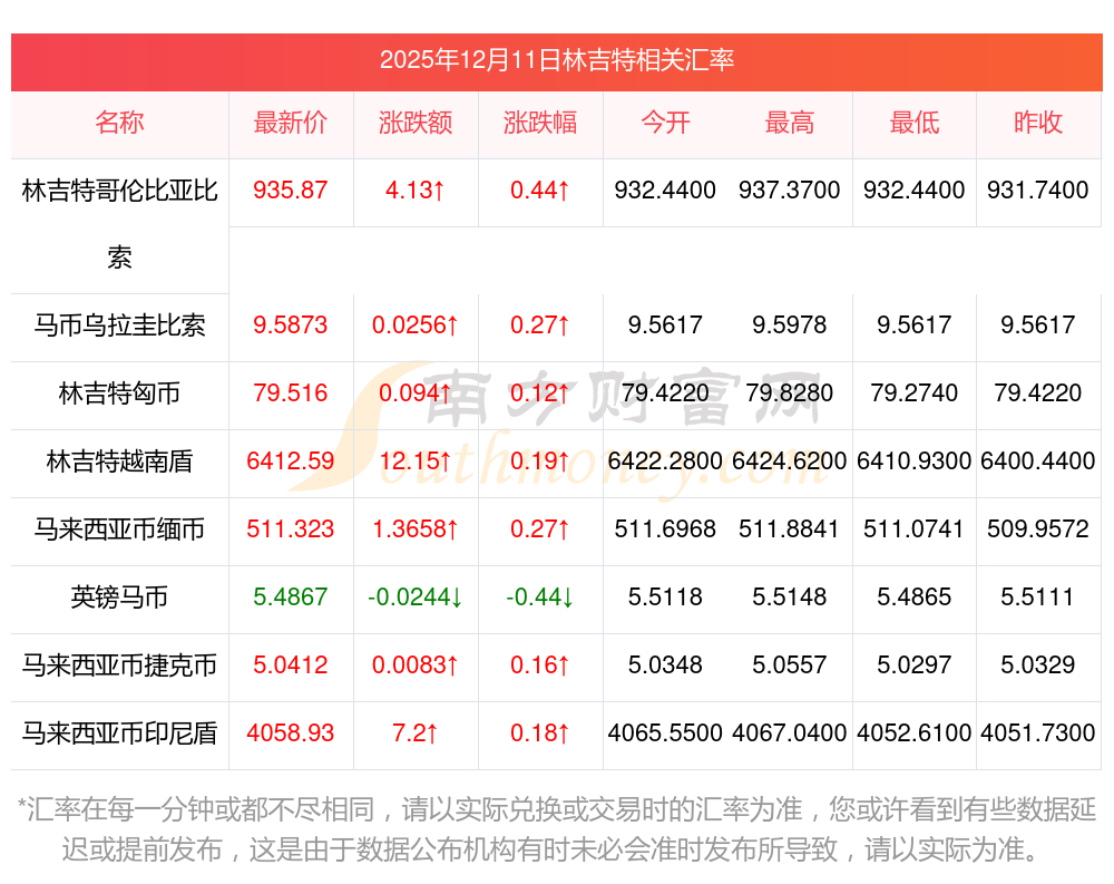 2025年12月11日最新消息,林吉特兌換哥倫比亞比索最新匯率為935.870000,今開為932.4400,昨收為931.7400,最高為937.3700,最低為932.4400。