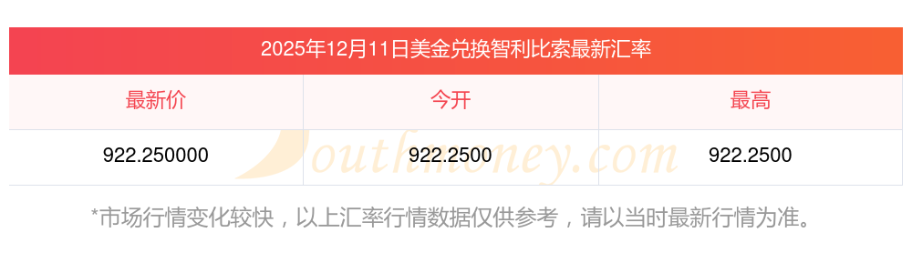 2025年12月11日美金對智利比索的匯率為:922.25