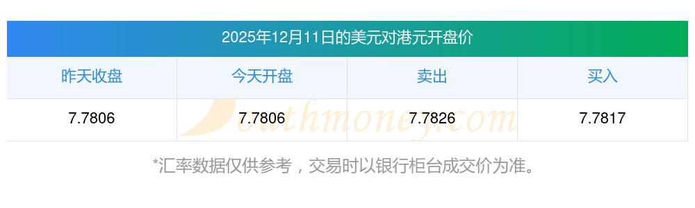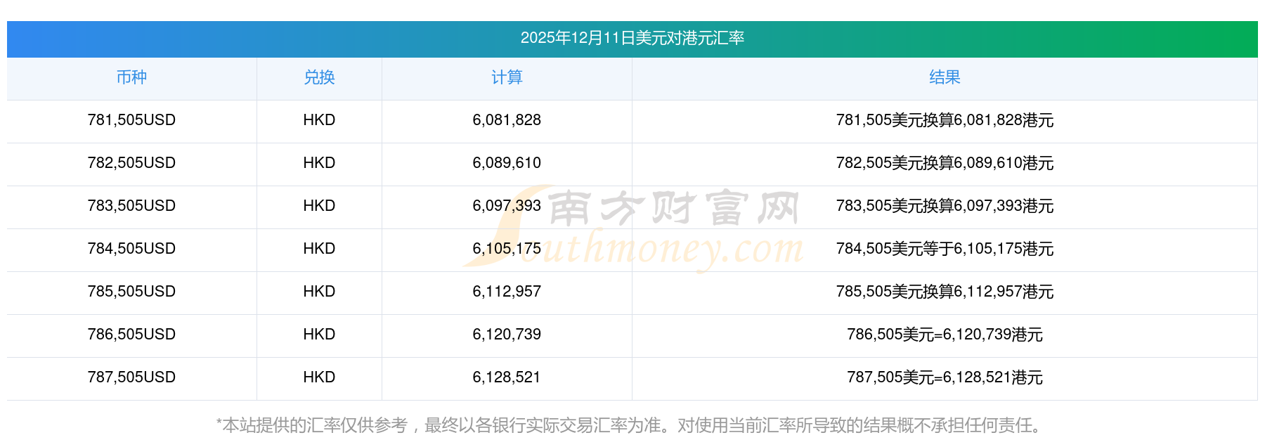 今天匯率行情:1美元兌港幣匯率多少(2025/12/11)