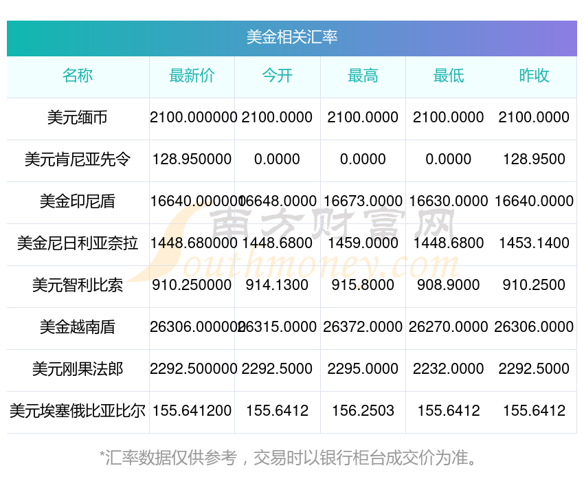 匯率數(shù)據(jù)僅供參考,交易時(shí)以銀行柜臺(tái)成交價(jià)為準(zhǔn)。