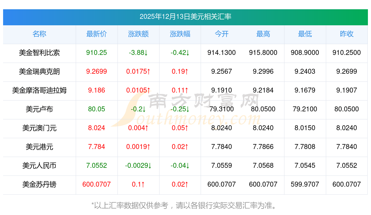 2025年12月13日美元相關(guān)匯率查詢