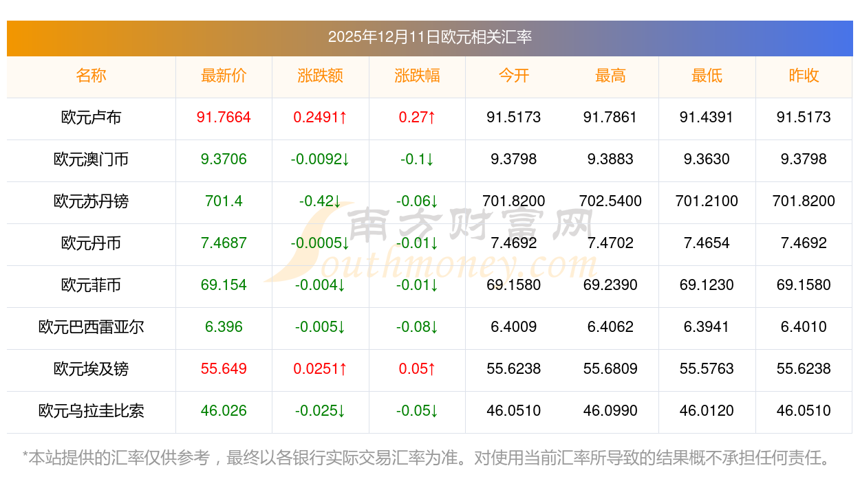 2025年12月11日最新消息,歐元兌換澳門幣最新匯率為9.370600,今開為9.3798,昨收為9.3798,最高為9.3883,最低為9.3630。